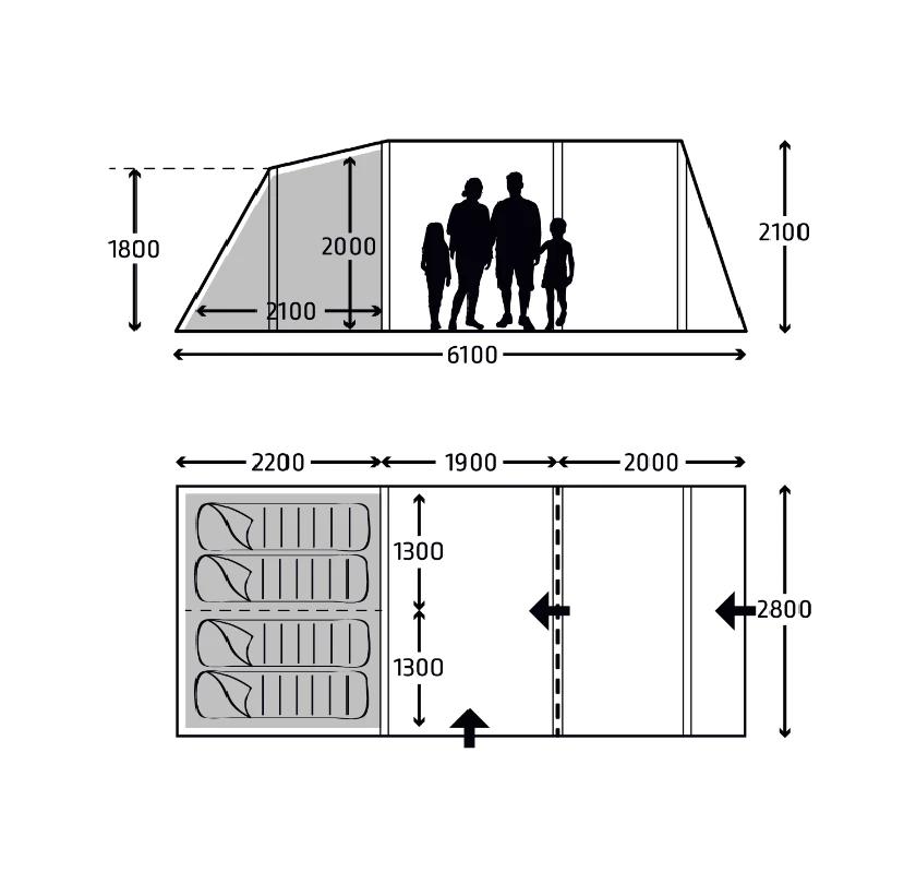 The Hayling 4 Air from Kampa has been a staple of BCH Camping for a good few years now. A classic 4 person inflatable tent, the Hayling 4 is ideal for couples, or for small families. It features a quick 8 minute pitching time with flysheet and inners pitching together. The tent is equipped with Kampa’s own AirFrame inflated beams, and a Weathershield 68D flysheet with a 4,000HH hydrostatic head gives you 100% waterproofing in the worst of weather. Toggle-up curtains offer you privacy, or shade when you desire. Additionally, the tent includes a sewn-in groundsheet and pump. There is a good amount of space inside this tent especially considering it’s only a 4 person. Bedrooms are at the back, next is a spacious living area and then a smaller living area that leads to a generous porch.
