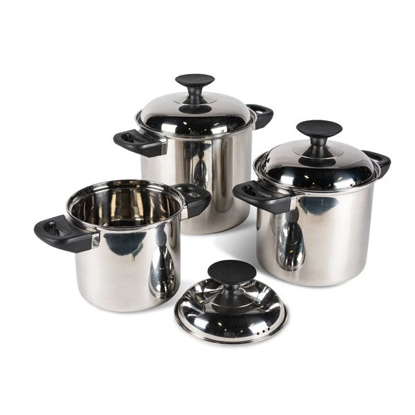 The Kampa Space Saver Cook Set comprises of 3 Steel pans, with heat resistant handles that nestle easily into each other for storage and transporting. Perfect for the Caravan or motorhome.