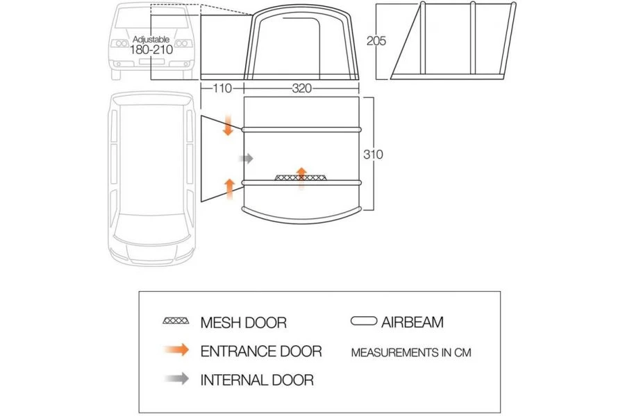 The 2023 Vango Cove II Low Drive Away Awning is a front facing awning that is perfect for couples or young families. It inflates in minutes,(pump provided) and attaches to your campervan on the side. It has a sewn in groundsheet which makes it an ideal storage or living area. If you fancy driving off for the day, the door/tunnel can be rolled away and easily re attached when you return. Diamond clear windows allow for great visibility and the outer is made from tough waterproof Sentinel Active fabric. The Cove Low will fit vans with a height of between 180cm -210cm.
